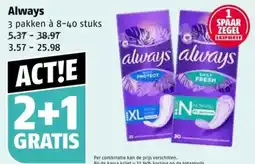 | Always inlegkruisjes fresh normal fresh scent Per 30 st | PLUS | € 2,99 | 21 januari 2026 | 27 januari 2026 | |||