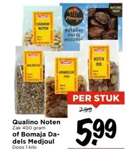 ![]() | Qualino Noten 400 gram of Bomaja Dadels Medjoul 1 kilo | Vomar Voordeelmarkt | € 7,99 | € 5,99 | € 2,00 Korting | 24 augustus 2025 | 30 augustus 2025 |