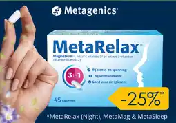| Metagenics Metarelax (45 Tabletten) | Holland & Barrett | € 18,90 | € 14,17 | 25% korting | 09 september 2025 | 03 februari 2026 | |