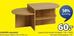 | 2 | Lisbjerg salontafel 60 x 107 x 45 cm | Jysk | € 119,00 | € 60,00 | 50% korting | 15 december 2025 | 21 december 2025 | Bekijk aanbieding | |