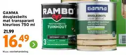 | 2 | Gamma douglasbeits mat transparant kleurloos 750 ml | GAMMA | € 21,99 | € 16,49 | € 5,50 Korting | 27 februari 2026 | 01 maart 2026 | Bekijk aanbieding | |