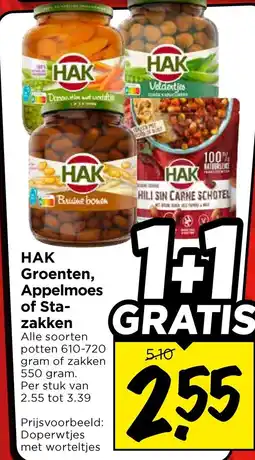 | 1 | HAK Groenten, Appelmoes of Sta- zakken 610 - 720 gram 1+1 GRATIS | Vomar Voordeelmarkt | € 5,10 | € 2,55 | 1+1 GRATIS | 26 februari 2026 | 28 februari 2026 | Bekijk aanbieding | |