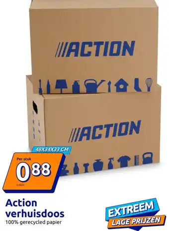 De Action verhuisdoos is gemaakt van 100% gerecycled papier en heeft een afmeting van 48X34X33 CM. Deze verhuisdoos is verkrijgbaar per stuk en heeft het artikelnummer 088. Bij Action vind je altijd EXTREEM LAGE PRIJZEN, dus ook voor verhuisdozen! Deze stevige verhuisdoos is ideaal voor het inpakken en vervoeren van al je spullen tijdens een verhuizing. Dankzij het gebruik van gerecycled papier is deze doos ook nog eens milieuvriendelijk. Of je nu gaat verhuizen naar een nieuw huis of gewoon wat spullen wilt opbergen, met de Action verhuisdoos weet je zeker dat je spullen veilig en goed beschermd zijn. Bestel vandaag nog jouw verhuisdozen bij Action en profiteer van de scherpe prijzen!