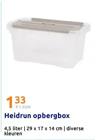 De prijs van de Heidrun opbergbox kan ook teruggevonden worden hierboven op de pagina, samen met de datum van wanneer de aanbieding beschikbaar is. Ook kun je de prijzen in de huidige Action folder of op de Action website controleren. De aanbiedingen verzekeren je van het kopen van de Action producten voor de laagste prijs.