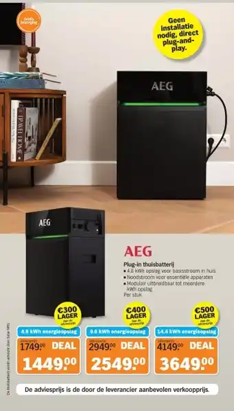 Bekijk de meest recente aanbiedingen en blijf op de hoogte van welke winkels AEG Plug in thuisbatterij op korte termijn met korting aanbieden. Niemand betaalt graag te veel – daarom houden wij de prijzen scherp in de gaten. Pas je (boodschappen)lijst aan op basis van acties van deze week én verwachte deals. Sommige aanbiedingen gelden alleen in de winkel, dus check regelmatig waar AEG Plug in thuisbatterij het voordeligst verkrijgbaar is.Veelgestelde vragen over AEG Plug in thuisbatterij