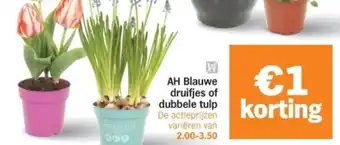 Geniet van prachtige bloemen in huis met de AH Blauwe druifjes of dubbele tulp. Deze bloemen zijn verkrijgbaar in verschillende kleuren en soorten, zoals de MUSCARI BLUE. Profiteer nu van de actieprijzen die variëren van €2.00 tot €3.50 en ontvang €1 korting. Breng kleur en leven in je interieur met deze vrolijke bloemen. Of geef ze cadeau aan een vriend of familielid om hen op te vrolijken. De blauwe druifjes en dubbele tulpen zijn makkelijk te verzorgen en zorgen voor een gezellige sfeer in huis. Haal de lente in huis met deze prachtige bloemen van Albert Heijn.