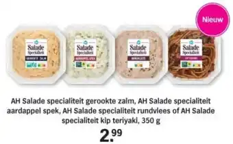 AH Salade specialiteit gerookte zalm, AH Salade specialiteit aardappel spek, AH Salade specialiteit rundvlees aanbieding bij Albert Heijn