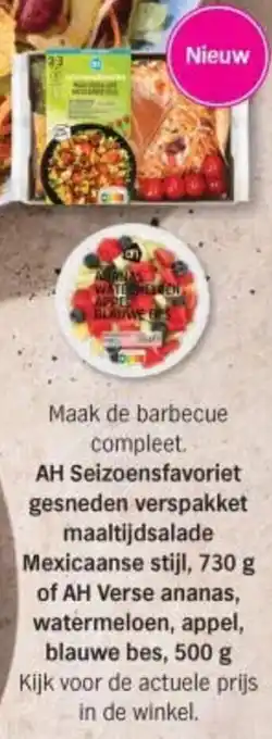 Koop AH Seizoensfavoriet gesneden verspakket maaltijdsalade Mexicaanse stijl of AH Verse ananas, watermeloen, appel, blauwe bes komende week met korting