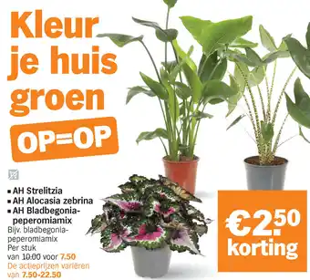 AH Strelitzia ,AH Alocasia zebrina of AH Bladbegonia-peperomia mix aanbieding bij Albert Heijn