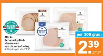 Nu in de aanbieding bij Albert Heijn: Alle AH Scharrelkipfilet vleeswaren✅ Actie geldig van 9-03 t/m 15-03.