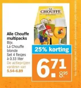 De prijs van de Alle Chouffe multipacks kan ook teruggevonden worden hierboven op de pagina, samen met de datum van wanneer de aanbieding beschikbaar is. Ook kun je de prijzen in de huidige Albert Heijn folder of op de Albert Heijn website controleren. De aanbiedingen verzekeren je van het kopen van de Albert Heijn producten voor de laagste prijs.