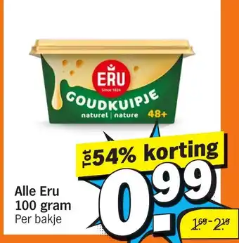 De prijs van de Alle Eru 100 gram kan ook teruggevonden worden hierboven op de pagina, samen met de datum van wanneer de aanbieding beschikbaar is. Ook kun je de prijzen in de huidige Albert Heijn folder of op de Albert Heijn website controleren. De aanbiedingen verzekeren je van het kopen van de Albert Heijn producten voor de laagste prijs.