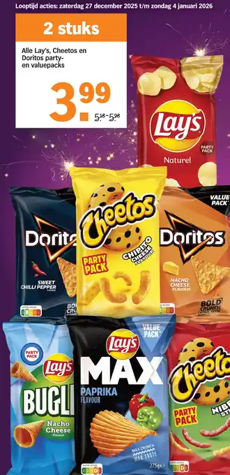 Nu in de aanbieding bij Albert Heijn: Alle Lay's, Cheetos en Doritos party en valuepacks✅ Actie geldig van 27-12 t/m 4-01.