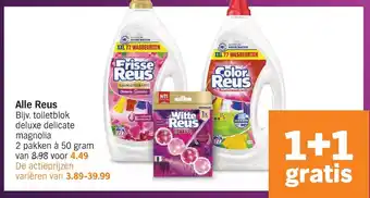 Albert Heijn biedt naast de Alle Reus een ruime collectie producten aan. Houd de wekelijkse Albert Heijn folder in de gaten om de beste aanbiedingen en acties te vinden. Naast Alle Reus, kunt u ook de volgende aanbiedingen vinden: Alle Witte Reus of Fleuril, Witte Reus Wasmiddel Frisse Reus & Witte Reus Color Reus Waspoeder.