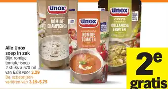 Geniet van een ruime keuze aan heerlijke Unox soepen in zakken. Van romige tomatensoep tot rijke champignonsoep, er is voor ieder wat wils. De actieprijzen variëren van 3.19 tot 5.75, dus je kunt voordelig je favoriete smaakfavoriet inslaan. Elke zak bevat 2 stuks van 570 ml, zodat je altijd een lekkere en voedzame maaltijd bij de hand hebt. De soepen zijn rijkgevuld met groenten, vezels en eiwitten, waardoor ze niet alleen lekker zijn, maar ook nog eens gezond. Probeer bijvoorbeeld de romige tomatensoep met extra vezels of de Hollandse erwtensoep voor een hartverwarmende maaltijd. Koop nu 2 zakken en ontvang de 2e zak gratis!