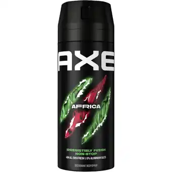 Albert Heijn biedt naast de Axe Africa deodorant bodyspray een ruime collectie producten aan. Houd de wekelijkse Albert Heijn folder in de gaten om de beste aanbiedingen en acties te vinden. Naast Axe Africa deodorant bodyspray, kunt u ook de volgende aanbiedingen vinden: Axe Africa Deodorant & Bodyspray, 2+1 gratis: Axe Deodorant Bodyspray Africa 200 & 2+1 gratis: Axe Deodorant Bodyspray Africa 150.