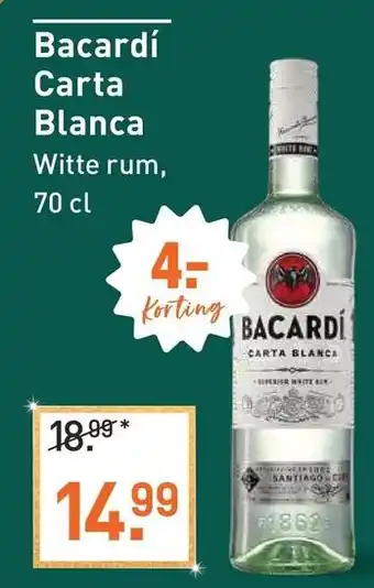 De aanbieding is verkrijgbaar in verschillende winkels, bekijk alle producten om de goedkoopste Bacardí Carta Blanca te krijgen. Als je graag wilt kijken of het artikel met meer korting te koop is in een andere winkel, bekijk de categorie 'Supermarkt'. Wellicht vind je deze aanbiedingen ook interessant: Bacardí Carta Blanca 70CL, Bacardí Carta blanca & Bacardi Carta Blanca.