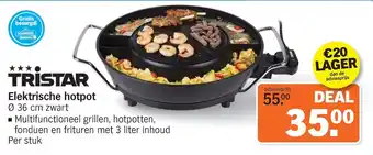 De Elektrische hotpot van TRISTAR is een multifunctioneel apparaat waarmee je kunt grillen, hotpotten, fonduen en frituren. Met een inhoud van 3 liter is er genoeg ruimte voor al je favoriete gerechten. Deze hotpot wordt geleverd per stuk en heeft een adviesprijs van €55.00. Bij VOORDEEL SHOP.NL betaal je echter slechts €20 lager dan de adviesprijs. Bovendien wordt de Elektrische hotpot gratis bezorgd! Met zijn compacte formaat van 0.36 cm en elegante zwarte design past hij perfect in elke keuken. Profiteer nu van deze geweldige deal en haal de TRISTAR Elektrische hotpot in huis voor een voordelige prijs.
