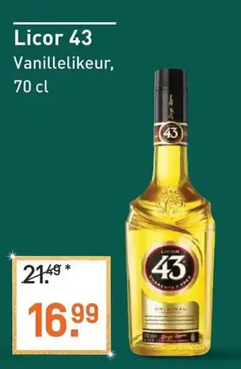 Geniet van de heerlijke smaak van Licor 43 Vanillelikeur in een handige fles van 70 cl. Deze likeur heeft een unieke mix van 43 geheime ingrediënten en een vleugje vanille, wat zorgt voor een zachte en zoete smaakbeleving. Perfect om puur te drinken als digestief na een maaltijd, maar ook heerlijk in cocktails of koffie. Met een alcoholpercentage van 31% is Licor 43 Vanillelikeur een veelzijdige drank die bij elke gelegenheid past. Bestel nu jouw fles Licor 43 Vanillelikeur voor slechts €16.99* en ontdek zelf waarom deze likeur wereldwijd geliefd is. Proost op genieten met Licor 43!
