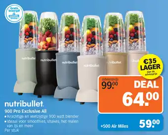 De Nutribullet 900 Pro Exclusive All is een krachtige en veelzijdige 900 watt blender, ideaal voor het maken van smoothies, shakes, het malen van ijs en nog veel meer. Bij VOORDEEL SHOP.NL is deze blender nu verkrijgbaar voor een prijs die lager ligt dan de adviesprijs. Bovendien ontvang je bij aankoop van de Nutribullet 900 Pro Exclusive All ook nog eens +500 Air Miles. Profiteer nu van deze deal en laat de blender gratis bezorgen bij jou thuis. Mis deze kans niet en bestel de Nutribullet 900 Pro Exclusive All vandaag nog bij VOORDEEL SHOP.NL!