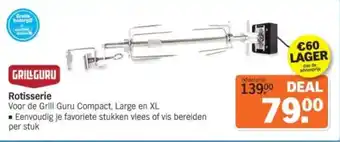 Met de GRILLGURU Rotisserie kun je eenvoudig je favoriete stukken vlees of vis bereiden per stuk. Deze Rotisserie is geschikt voor de Grill Guru Compact, Large en XL modellen. En het beste van alles, je bespaart maar liefst €60 ten opzichte van de adviesprijs van €139! Daarnaast wordt de Rotisserie gratis bezorgd, dus je hoeft je geen zorgen te maken over extra kosten. Met deze deal krijg je een hoogwaardige Rotisserie van GRILLGURU voor een scherpe prijs. Geniet van heerlijk gegrild vlees en vis met de GRILLGURU Rotisserie en maak indruk op je vrienden en familie tijdens je volgende barbecue!