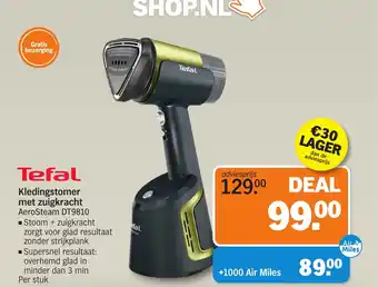 Met de Tefal Kledingstomer met zuigkracht AeroSteam DT9810 krijg je een glad resultaat zonder strijkplank. Dankzij de stoom + zuigkracht functie is je overhemd al glad in minder dan 3 minuten per stuk. Bestel nu op SHOP.NL en profiteer van het VOORDEEL van €30 LAGER dan de adviesprijs van €129.00. Bovendien ontvang je +1000 Air Miles bij aankoop voor slechts 8900 Air Miles. En als kers op de taart wordt de kledingstomer gratis bezorgd. Maak het jezelf gemakkelijk en bespaar tijd met deze handige Tefal kledingstomer met zuigkracht AeroSteam DT9810.