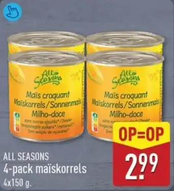 De prijs van de All Seasons Maïskorrels kan ook teruggevonden worden hierboven op de pagina, samen met de datum van wanneer de aanbieding beschikbaar is. Ook kun je de prijzen in de huidige ALDI folder of op de ALDI website controleren. De aanbiedingen verzekeren je van het kopen van de ALDI producten voor de laagste prijs.