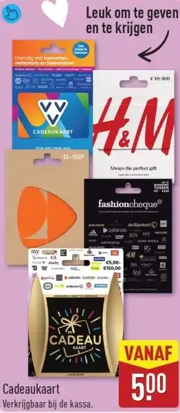 ALDI biedt naast de Cadeaukaart een ruime collectie producten aan. Houd de wekelijkse ALDI folder in de gaten om de beste aanbiedingen en acties te vinden. Naast Cadeaukaart, kunt u ook de volgende aanbiedingen vinden: Cadeaukaart, Cadeaukaart & Hunkemöller cadeaukaart.