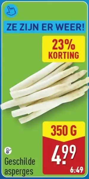 De Geschilde asperges is momenteel met korting verkrijgbaar bij ALDI. Hier vind je alle details over prijs, geldigheidsduur en actievoorwaarden. Vergeet niet om ook andere aanbiedingen en deals voor Geschilde asperges te bekijken zodat je zeker weet dat je de beste prijs betaalt. De kortingsactie loopt van 07-04-2026 tot 12-04-2026. Is de actie inmiddels verlopen? Geen zorgen, vergelijk dan soortgelijke aanbiedingen of volg de productcategorie voor toekomstige prijsverlagingen. Zo koop je altijd met voordeel.Veelgestelde vragen over Geschilde asperges
