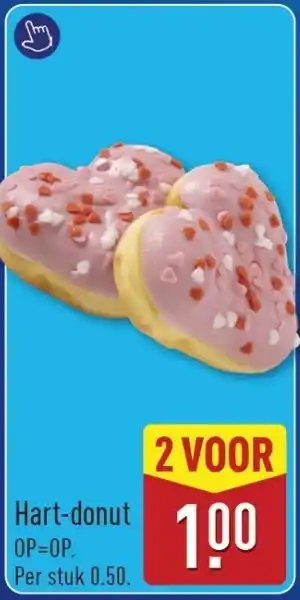De prijs van de Hart-donut kan ook teruggevonden worden hierboven op de pagina, samen met de datum van wanneer de aanbieding beschikbaar is. Ook kun je de prijzen in de huidige ALDI folder of op de ALDI website controleren. De aanbiedingen verzekeren je van het kopen van de ALDI producten voor de laagste prijs.