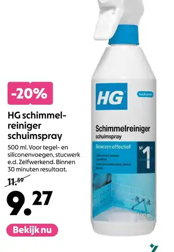 De HG Schimmelreiniger Schuimspray is een bewezen effectieve reiniger van 500 ml voor tegel- en siliconenvoegen, stucwerk, en meer. De schuimspray werkt zelfstandig en levert binnen 30 minuten resultaat. Nu met 20% korting, van €11.59 voor slechts €9.27. Bekijk nu en maak korte metten met schimmel in huis met HG Schimmelreiniger.