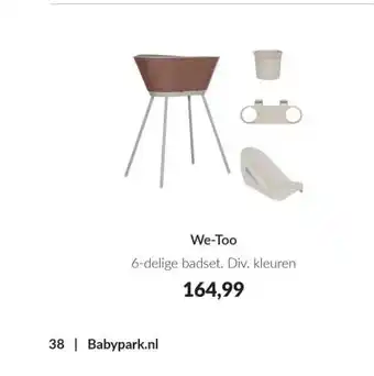 Babypark biedt naast de We-Too een ruime collectie producten aan. Houd de wekelijkse Babypark folder in de gaten om de beste aanbiedingen en acties te vinden. Naast We-Too, kunt u ook de volgende aanbiedingen vinden: We-Too, We-Too & We-Too waskussen.