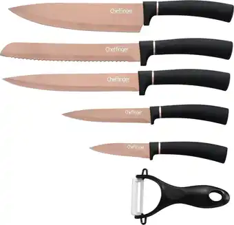 De prijs van de Cheffinger Messenset - 6-delig - Rose Goud / Zwart kan ook teruggevonden worden hierboven op de pagina, samen met de datum van wanneer de aanbieding beschikbaar is. Ook kun je de prijzen in de huidige Bol.com folder of op de Bol.com website controleren. De aanbiedingen verzekeren je van het kopen van de Bol.com producten voor de laagste prijs.