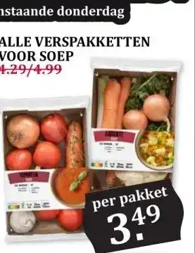 De prijs van de ALLE VERSPAKKETTEN VOOR SOEP kan ook teruggevonden worden hierboven op de pagina, samen met de datum van wanneer de aanbieding beschikbaar is. Ook kun je de prijzen in de huidige Boon`s Markt folder of op de Boon`s Markt website controleren. De aanbiedingen verzekeren je van het kopen van de Boon`s Markt producten voor de laagste prijs.