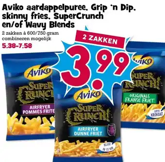 Aviko aardappelpuree, Grip 'n Dip. skinny fries. SuperCrunch en/of Wavy Blends aanbieding bij Boon`s Markt – binnenkort verwacht