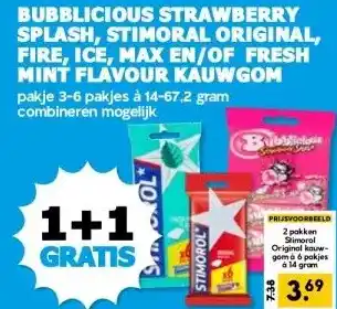 BUBBLICIOUS STRAWBERRY SPLASH, STIMORAL ORIGINAL, FIRE, ICE, MAX EN/OF FRESH MINT FLAVOUR KAUWGOM aanbieding bij Boon`s Markt – binnenkort verwacht