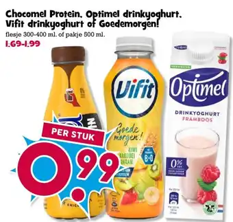 Chocomel Protein, Optimel drinkyoghurt, Vifit drinkyoghurt of Goedemorgen!