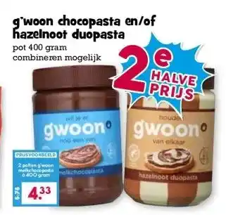 g'woon chocopasta en/of hazelnoot duopasta korting bij Boon`s Markt