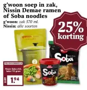 g'woon soep in zak, Nissin Demae ramen of Soba noodles korting bij Boon`s Markt