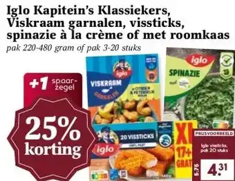 Iglo Kapitein's Klassiekers, Viskraam garnalen, vissticks, spinazie à la crème of met roomkaas aanbieding en online acties bij Boon`s Markt