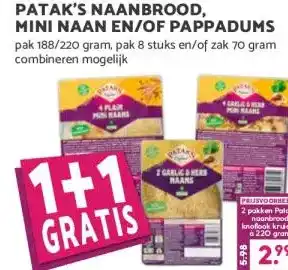 Nu in de aanbieding bij Boon`s Markt: PATAK'S NAANBROOD, MINI NAAN EN/OF PAPPADUMS✅ Actie geldig van 27-04 t/m 3-05.