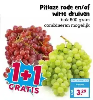 De prijs van de Pitloze rode en/of witte druiven kan ook teruggevonden worden hierboven op de pagina, samen met de datum van wanneer de aanbieding beschikbaar is. Ook kun je de prijzen in de huidige Boon`s Markt folder of op de Boon`s Markt website controleren. De aanbiedingen verzekeren je van het kopen van de Boon`s Markt producten voor de laagste prijs.