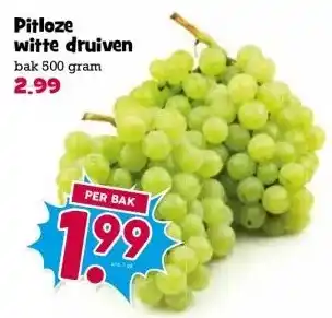 De prijs van de Pitloze witte druiven kan ook teruggevonden worden hierboven op de pagina, samen met de datum van wanneer de aanbieding beschikbaar is. Ook kun je de prijzen in de huidige Boon`s Markt folder of op de Boon`s Markt website controleren. De aanbiedingen verzekeren je van het kopen van de Boon`s Markt producten voor de laagste prijs.