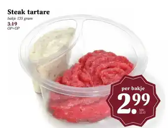 De aanbieding is verkrijgbaar in verschillende winkels, bekijk alle producten om de goedkoopste Steak tartare te krijgen. Als je graag wilt kijken of het artikel met meer korting te koop is in een andere winkel, bekijk de categorie 'Supermarkt'. Wellicht vind je deze aanbiedingen ook interessant: Steak tartare, Steak tartare & Steak tartare.