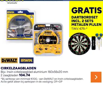 Koop nu bijvoorbeeld het Irwin cirkelzaagblad aluminium 160x56x20 mm, inclusief 2 zaagbladen voor slechts 104.74 euro. Bij aankoop van minimaal €100,- aan DeWALT en Irwin cirkelzaagbladen ontvang je een gratis dartbordset inclusief 2 sets metalen pijlen. Deze actie geldt alleen bij aankopen in de vestiging, dus wees er snel bij want op is op! De Dewalt en Irwin cirkelzaagbladen zijn ideaal voor het zagen van non ferrous metalen en leveren meer sneden per lading dankzij de XRUNTIME technologie. Met een maximale zaagdiepte van 35mm en een hogere zaagsnelheid dan vergelijkbare producten, zijn deze cirkelzaagbladen perfect voor professioneel gebruik. Mis deze officiële competitie Longfield darts niet en profiteer van de kwaliteit van Dewalt en Irwin.