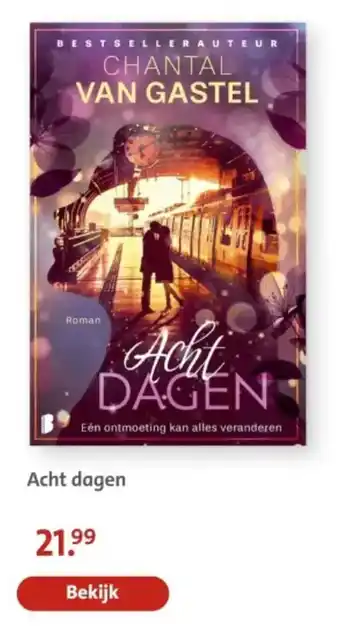 In de roman 'Acht dagen' van de bestsellerauteur Chantal van Gastel draait het om de kracht van één ontmoeting die alles kan veranderen. Voor slechts 21.99 euro kun je dit boek bekijken en meegenomen worden in het verhaal van hoofdpersonage Tess. Na een heftige gebeurtenis in haar leven besluit Tess om acht dagen lang op reis te gaan naar een onbekende bestemming. Tijdens deze reis komt ze voor verrassende wendingen en ontmoetingen te staan die haar kijk op het leven veranderen. Een inspirerend verhaal over zelfontdekking, liefde en de kracht van het onverwachte. Laat je meeslepen door de woorden van Chantal van Gastel en ontdek wat acht dagen kunnen betekenen in het leven van Tess.