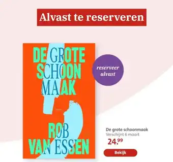 Reserveer alvast de nieuwe roman 'De grote schoonmaak' van Rob van Essen. Dit boek verschijnt op 6 maart en is te koop voor 24.99. In deze meeslepende roman neemt de auteur je mee op een intrigerende reis vol verrassende wendingen en diepgaande thema's. Laat je meeslepen door het verhaal van de hoofdpersonages en ontdek hoe zij hun leven proberen op te ruimen en opnieuw vorm te geven. Met zijn scherpe observaties en meeslepende schrijfstijl weet Rob van Essen je vanaf de eerste pagina te boeien. Bekijk nu alvast de details en reserveer jouw exemplaar van 'De grote schoonmaak' voor een onvergetelijke leeservaring.