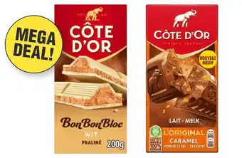 Koop Côte D'Or Chocolade Melk Karamel-Zeezout of BonBon Bloc Wit Praliné komende week met korting