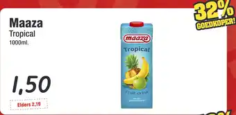 De prijs van de Maaza Tropical kan ook teruggevonden worden hierboven op de pagina, samen met de datum van wanneer de aanbieding beschikbaar is. Ook kun je de prijzen in de huidige Budget Food folder of op de Budget Food website controleren. De aanbiedingen verzekeren je van het kopen van de Budget Food producten voor de laagste prijs.