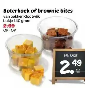 De prijs van de Boterkoek of brownie bites kan ook teruggevonden worden hierboven op de pagina, samen met de datum van wanneer de aanbieding beschikbaar is. Ook kun je de prijzen in de huidige Coop folder of op de Coop website controleren. De aanbiedingen verzekeren je van het kopen van de Coop producten voor de laagste prijs.